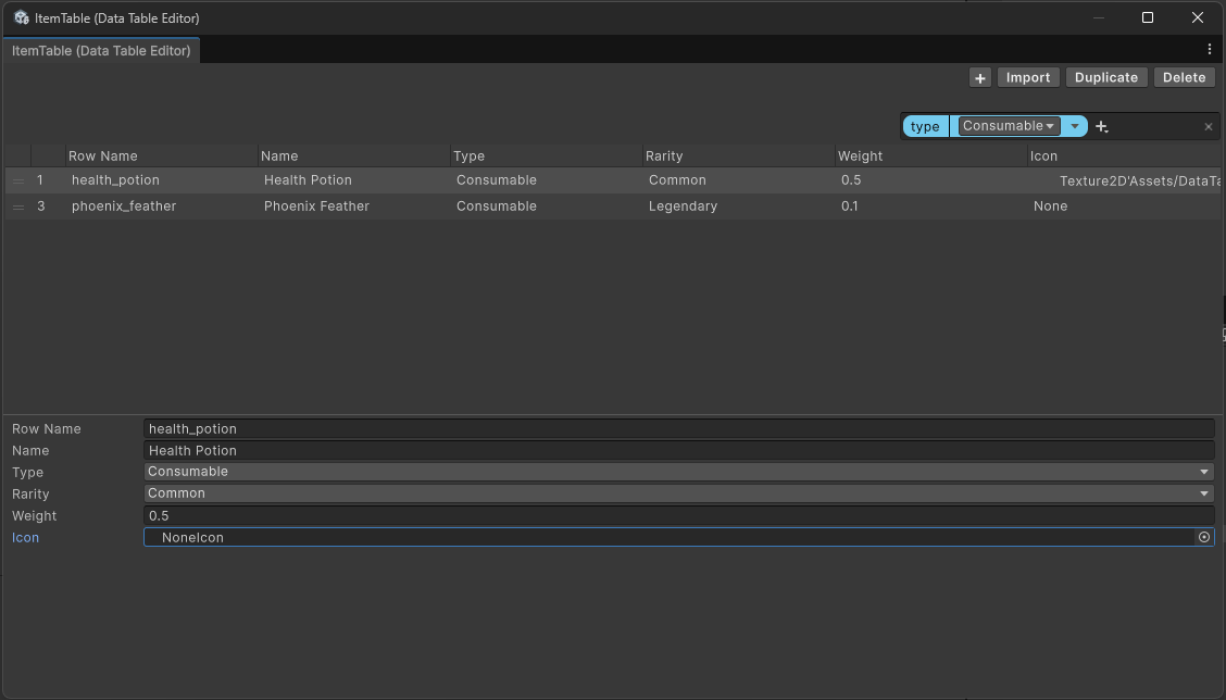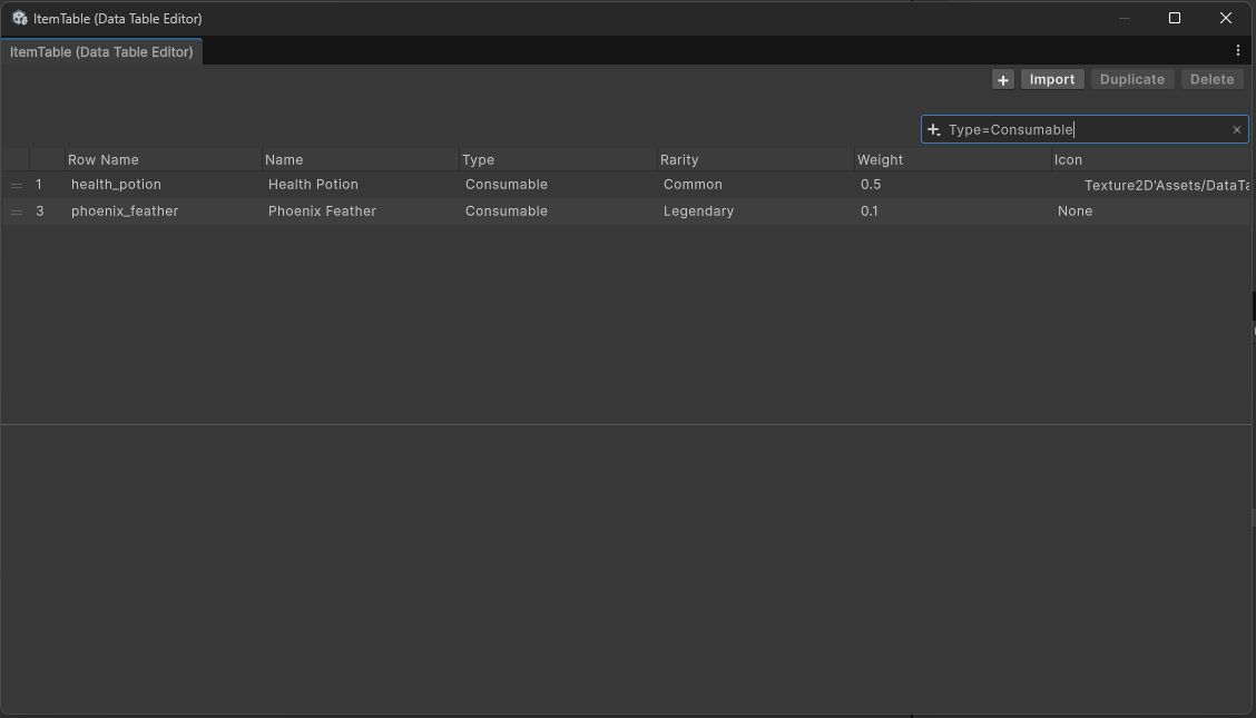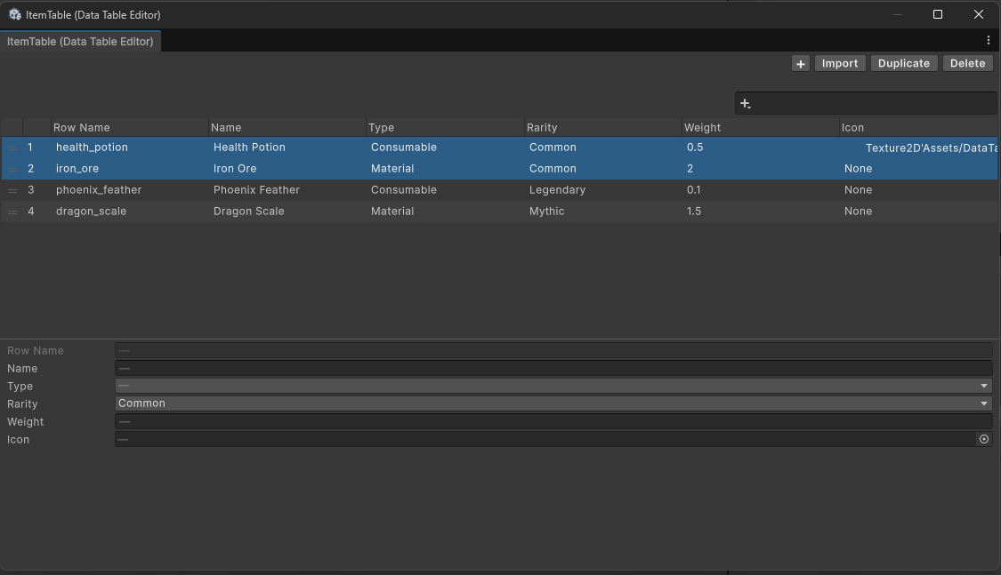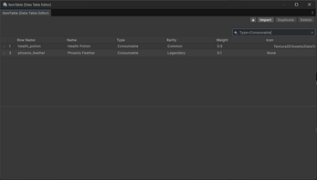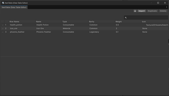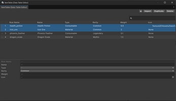 You can create, edit, duplicate, and delete rows of data without leaving the editor. It's great for organizing game data like stats, drop table and more.